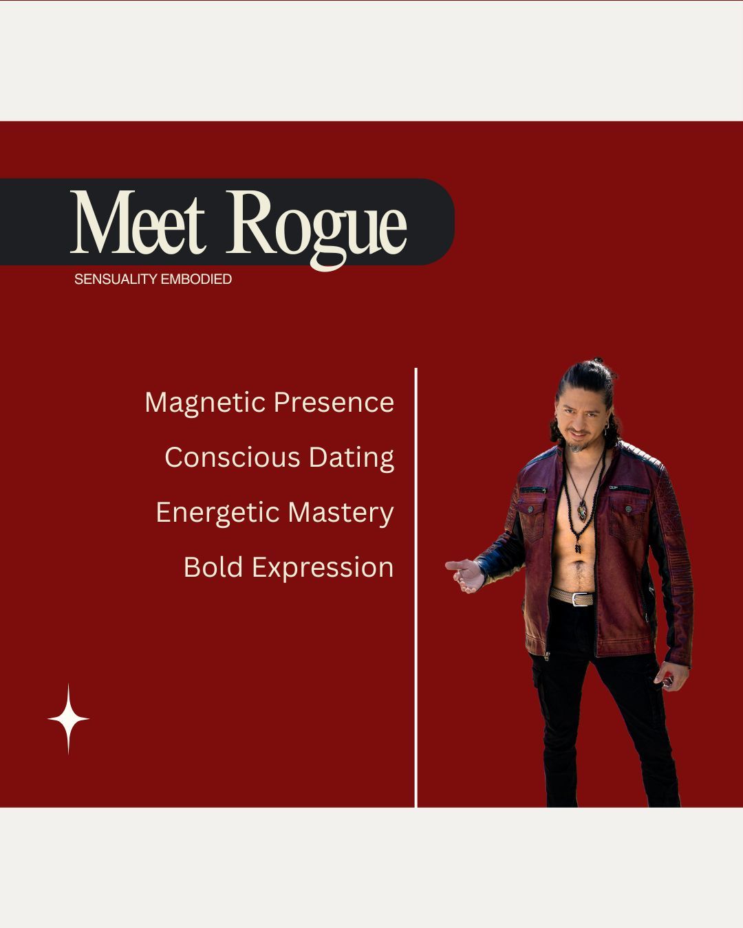 With a background in classical guitar, film, and metaphysics, Rogue blends intellect, intuition, and primal energy into his teachings. His approach transcends outdated paradigms, focusing on embodiment over performance and authentic connection over rehearsed lines.